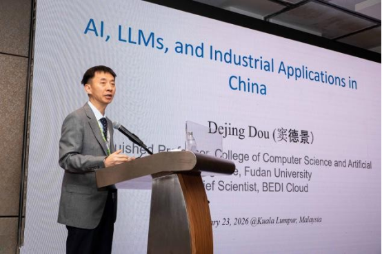 近日,“2026中国-东盟人工智能前沿技术与治理高层次研讨会”在马来西亚吉隆坡成功举办。致力于赋能中国AI产业发展的新国企,北京电子数智科技有限责任公司(简称“北电数智”)首席科学家窦德景教授受邀出席,发表《人工智能、大语言模型及其在中国的产业应用》主题演讲,分享AI在医疗、工业制造等领域的实践成果,为东盟各国提供中国AI新国企引领的产业变革参考。